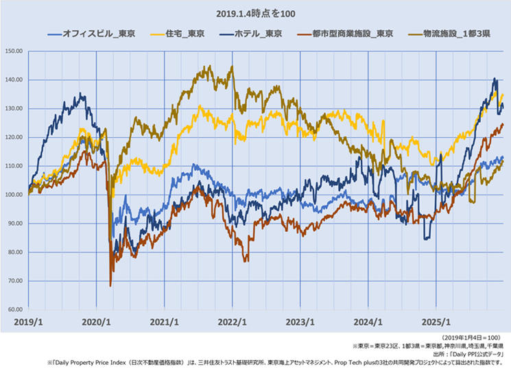 - 「Daily Property Price Index(日次不動産価格指数)」(以下、Daily PPI)は、三井住友トラスト基礎研究所、東京海上アセットマネジメント、Prop Tech plusの3社の共同開発プロジェクトによって算出された指数です。Daily PPIの指数値およびDaily PPIにかかる標章または商標は、三井住友トラスト基礎研究所およびProp Tech plusの知的財産であり、指数の算出、指数値の公表、利用等、Daily PPIに関するすべての権利・ノウハウおよびDaily PPIにかかる標章または商標に関するすべての権利は三井住友トラスト基礎研究所およびProp Tech plusが有します。