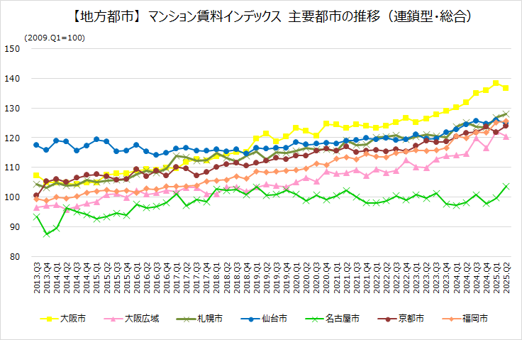2025年Q2の賃料(連鎖型・総合)は、全エリアで前年同期比プラスとなっており、仙台市を除く各都市では+2.0pt以上の賃料上昇となっている。転居費用の高騰によって移動時期をずらす世帯が増えており、3月の転居シーズンを終えたあと、4月以降も人口流入が多く、大都市では賃貸需要が旺盛であった。東京・大阪・名古屋の3大都市のほか、横浜・川崎・福岡の需給はひっ迫しており、高い賃料上昇となった。
