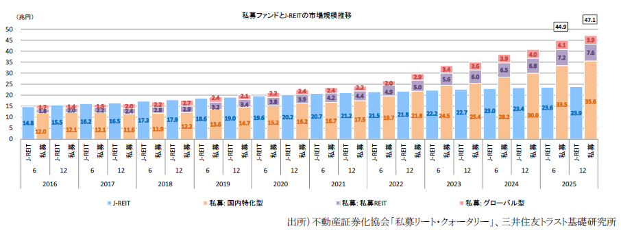 不動産私募ファンドの市場規模は、私募REIT・グローバルファンドを含めて47.1兆円と推計
